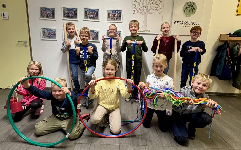 Große Freude an der Georgschule: Dank einer großzügigen Spende in Höhe von 500 € konnte der Spieleschuppen mit neuen Spielgeräten ausgestattet werden. Hüpfstangen, Stelzen, Seile und weitere Bewegungsspiele bereichern nun die Pausen.